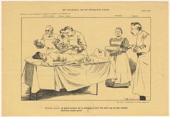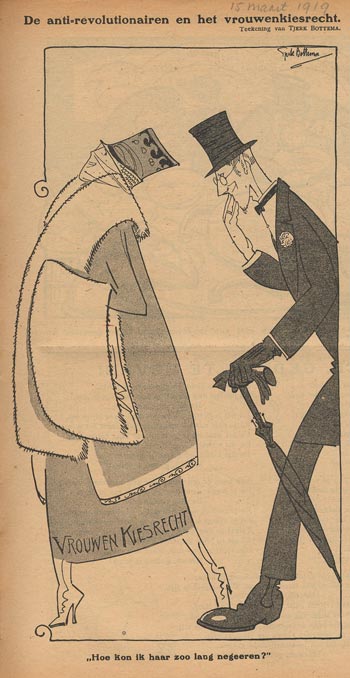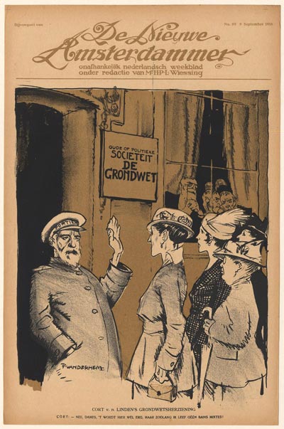 At the constitutional amendment of 1917 during the Cort van der Linden cabinet, all passive voting rights for both women and men were introduced, which led to the election (by men!) of Suze Groeneweg as the first woman in the Lower House. But active voting rights were only opened to men.