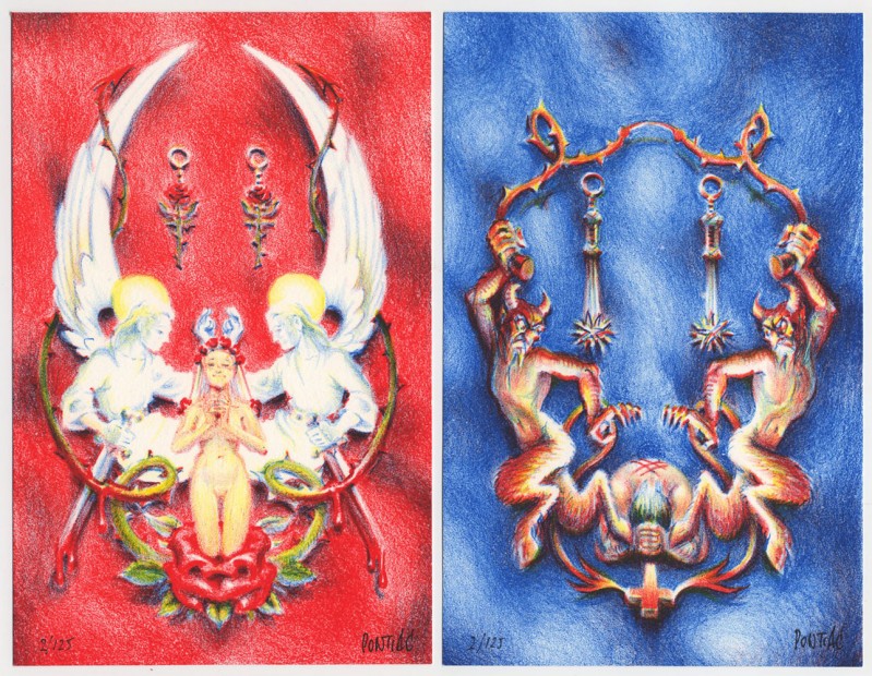 Dit doosje bevat 8 prentjes en een boekje, uitgevoerd in steendruk door meester-steendrukker Gert Jan Forrer. Thema's: Geboorte - dood, Hel - hemel, Liefde - oorlog en Honger - overvloed.