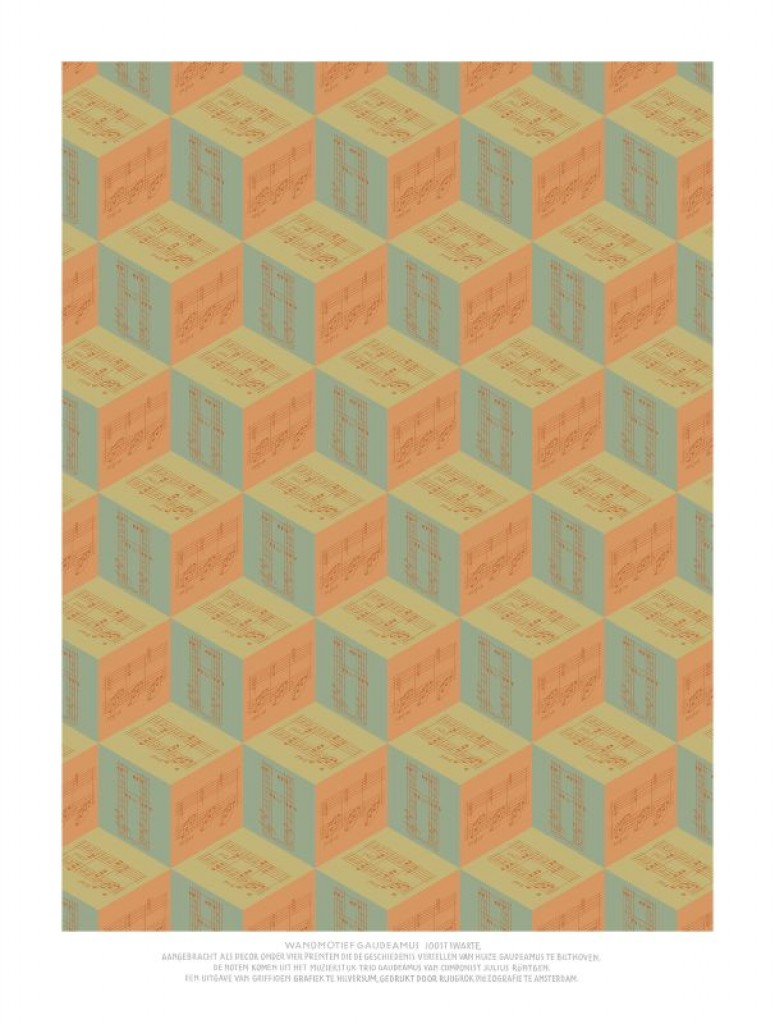 Joost Swarte ontwierp ook het behang voor de muur waarop de panelen bevestigd zijn. En dat bracht ons tot het volgende: Griffioen Grafiek doet voor haar klanten iets extra. De kopers van de portfolio Gaudeamus krijgen een gesigneerde prent van dit bijzondere behangontwerp cadeau!